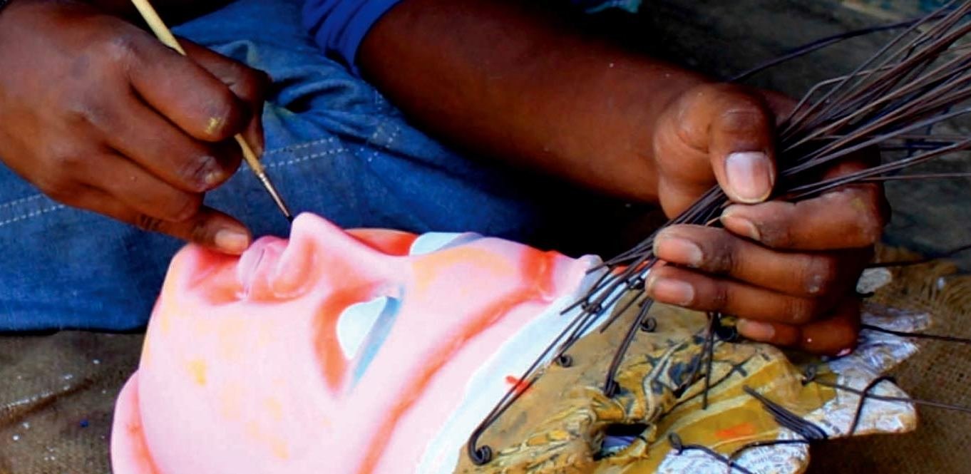 The magnificent masks of Purulia Chhau, crafted by artisans of Charida village, bring each character—gods, demons, heroes—to life. This 150-year-old craft tradition, begun under the patronage of King Madan Mohan Singh Deo of Baghmundi, continues today, blending devotion, artistry, and identity.